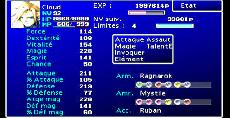 | Chance | La chance influe également sur plusieurs paramètres. La chance détermine la proportion de chance de bénéficier d'une attaque critique à la place d'une simple attaque physique, mais également la proportion de chance de bénéficier d'une "évasion chanceuse", dans lequel cas vous éviterez l'attaque subie (qu'elle soit magique ou physique). La formule qui correspond au pourcentage de chance de bénéficier d'"évasion chanceuse" est la suivante : % = [Chance/4]. Le pourcentage maximum est de 63%. Plus le personnage possède de chance, et plus il infligera de coups critiques et évitera les attaques ennemies. La limite est fixée à 255. | _Gain de level. _Utiliser une source de chance (l'endroit le plus adapté est l'avion coulé Gelnika, il vous suffira alors de transformer l'ennemi Mauvaise Tape afin de bénéficier d'une source de chance). |
