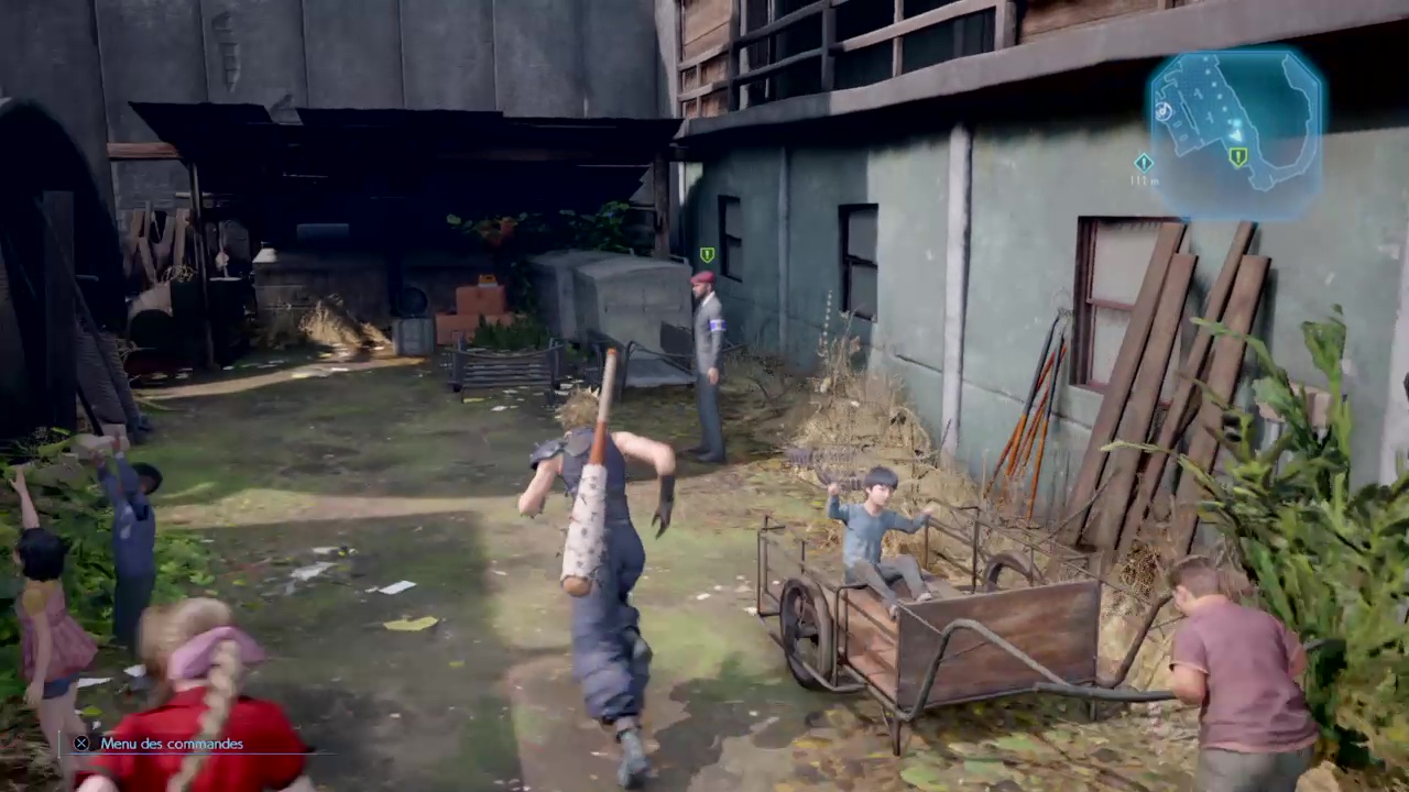 Allez affronter les 3 Manges-tout au Nord. Vous trouverez des caisses au bout du chemin de gauche. Une fois celles-ci détruites, revenez sur vos pas et dirigez vous cette fois à droite. Détruisez les caisses puis actionnez le mécanisme qui se trouve à côté d'Aerith. Remarquez au passage la manière dont Aerith courre, RI-DI-CU-LE
